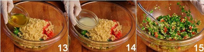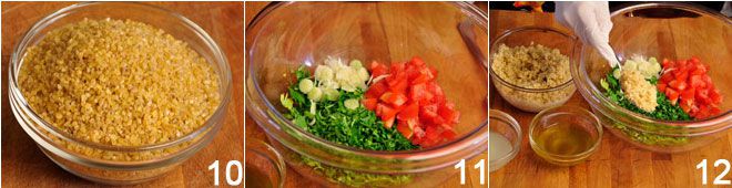 En un bol bastante grande, combinar el tomate en cubitos, el perejil y la cebolleta 11; añadir el bulgur ya frío 12,