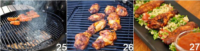 colocar las alitas, con el lado de la piel hacia arriba, en la parrilla 25 quitando los residuos de la marinada. La marinada debe ser desechada y no se puede utilizar para pincelar el pollo durante la cocción. Cerrar la tapa de la barbacoa, estabilizar la temperatura a 170° y dejar cocinar durante unos 20 minutos sin abrir la tapa. A mitad de cocción, dar la vuelta a las alitas 26, cerrar nuevamente la tapa y terminar la cocción durante otros 20 minutos. Una vez cocidas, poner en un recipiente y añadir la salsa barbacoa picante (por ejemplo, la salsa BBQ de Jack Daniel's y una buena dosis de tabasco) y dar vuelta para cubrir bien las alitas. Servir las hot wings sobre la cama de tabulé y la salsa barbacoa aparte 27. La frescura de la ensalada equilibrará perfectamente el sabor picante, especiado y ahumado de las alitas de pollo.