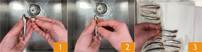 Para preparar los boquerones en freidora de aire, lo primero que hay que hacer es dedicarse a la Cómo limpiar boquerones (anchoas). Quítales la cabeza 1, tirando de ella suavemente, durante esta operación trata también de eliminar las vísceras del pescado. Ábrelos en forma de libro deslizando el dedo a lo largo de la espina 2, desde la cabeza hasta la cola. Luego quita la espina y enjuaga bien bajo el agua corriente. A medida que los limpies, colócalos en una bandeja cubierta con papel absorbente 3.