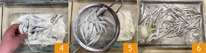 Pásalos luego, un poco a la vez, por la harina 4, después colócalos en un colador y sacúdelo para eliminar el exceso de harina 5. Transfiérelos a una bandeja o una fuente para mayor comodidad y rocíalos con aceite 6.