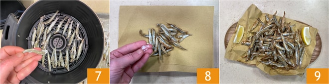 Coloca los boquerones en el cestillo de la freidora de aire (nosotros hemos utilizado una freidora con una capacidad de 6 litros) 7. Pon pocos a la vez bien espaciados. Cocina a 190°C durante 7-8 minutos. El tiempo de cocción depende del tamaño de los boquerones. Sácalos y sazónalos con sal 8. Los boquerones en freidora de aire están listos para ser degustados calientes 9.