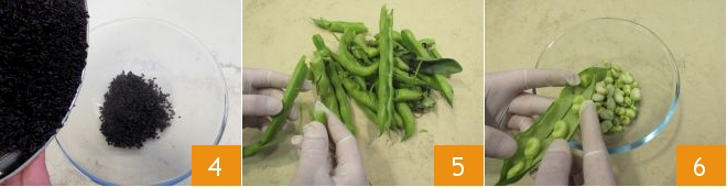 Cuando esté cocido, escurridlo y dejadlo enfriar vertiéndolo en un bol 4. Mientras el arroz se cuece, podéis preparar las verduras: comenzad con las habas: eliminad el filamento central luego cortad un extremo y abrid la vaina para desgranar (5-6): para esta operación podéis usar guantes de uso alimentario para no ensuciaros las manos. Una vez terminado, dejadlas a un lado.