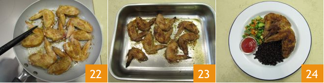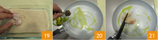 pasadlas por la mezcla de pan rallado asegurándoos de rebozarlas bien 19. Rocíad una sartén grande con aceite, calentadlo y luego colocad las alitas 20: doradlas por un lado y por el otro durante un par de minutos 21.