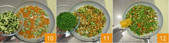 Agregad después los calabacines, saltead otros 3-4 minutos y finalmente añadid los guisantes 11. Continuad salteando, bajando ligeramente el fuego y removiendo de vez en cuando 12; proseguid la cocción hasta que los guisantes estén cocidos.