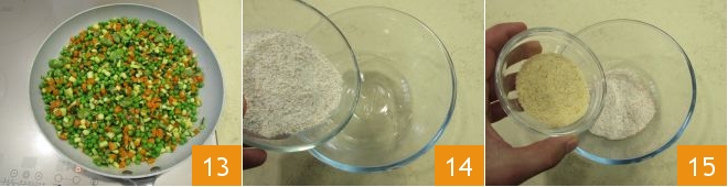Una vez listas, apagad el fuego y reservadlas calientes 13. Luego podéis dedicaros al rebozado de las alitas de pollo: en un bol verted la harina integral 14 y luego añadid el pan rallado 15,