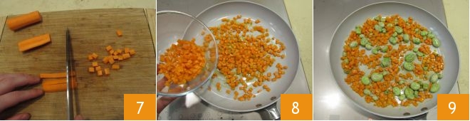 Continuad desgranando los guisantes; luego pelad y cortad las zanahorias, después cortadlas en bastones y finalmente en dados de 5 mm de grosor 7. Laváis y cortáis también los calabacines en dados de 5 mm. Luego pasad a la cocción: verted un chorrito de aceite en una sartén amplia, calentad y añadid las zanahorias primero 8; cocedlas 3-4 minutos a fuego alto, removiendo de vez en cuando, luego añadid las habas 9 y dejad cocinar otros 3-4 minutos.