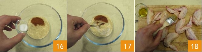 la paprika dulce y la sal 16. Mezclad bien todo 17 y colocad el rebozado aromatizado en un bol bajo y amplio. Luego untad cuidadosamente las alitas de pollo, bien limpias, con aceite 18.