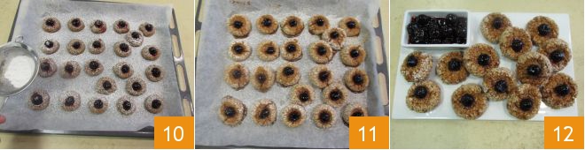 Espolvoree la superficie con azúcar glas 10 y hornee en horno estático a 160 °C durante 40 minutos. Al finalizar la cocción, retire la bandeja del horno 11, deje que se enfríen un poco y luego sirva sus amaretti con guindas en almíbar 12.