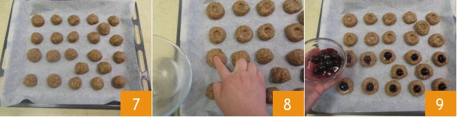 Coloque las bolas en una bandeja forrada con papel de horno 7, luego humedezca sus dedos con agua y presione en el centro de cada bola para crear una cavidad 8. Rellene con una guinda y su almíbar todos los biscochos 9.