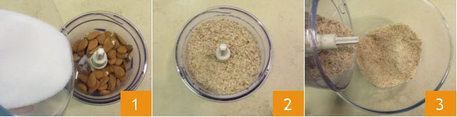 Para preparar los amaretti con guindas en almíbar, ponga las almendras en un mixer junto con el azúcar 1. Tritúrelas hasta reducirlas a polvo 2. Transfiera la mezcla obtenida a un bol 3.