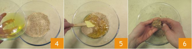 Agregue la clara de huevo 4 y mezcle con una espátula 5 para amalgamar la masa. Ahora tome una pequeña porción de masa, del tamaño de una nuez y con un peso de aproximadamente 25 g. Forme bolas con las manos 6, obtendrá alrededor de 24.