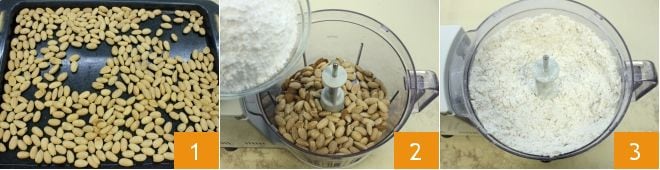 Para preparar los amaretti, tuesta las almendras peladas durante unos minutos en un horno estático precalentado a 200° 1. Luego colócalas en el triturador con las almendras amargas, el azúcar granulada y el azúcar glas 2 y tritura todo 3.