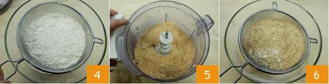 Luego tamiza la mezcla 4 antes de volver a colocarla en el triturador para triturarla aún más finamente 5. Tamízala nuevamente en un bol grande 6.