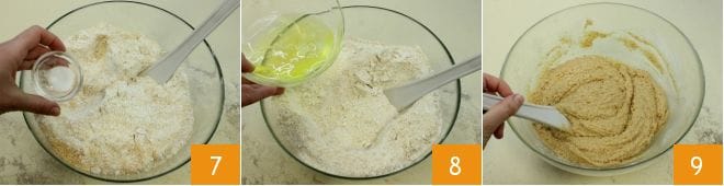 Ahora añade el bicarbonato amónico para repostería 7, las claras de huevo 8 y unas gotas de extracto de almendra amarga (opcional). Mezcla con una espátula para integrar los ingredientes y obtener una masa suave y homogénea 9.