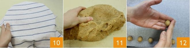 Cúbrela con un paño limpio 10 y coloca la masa en el frigorífico durante toda la noche. Al día siguiente, retoma la masa que se habrá solidificado 11 y forma aproximadamente 50 bolitas 12.