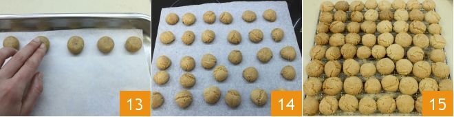 Puedes hornear en dos tandas, colocando 25 bolitas a la vez separadas entre sí en una bandeja forrada con papel de horno. Aplánalas ligeramente en el centro con los dedos 13 y hornea en un horno estático precalentado a 170° durante unos 20 minutos (150° durante 10-15 minutos si es horno ventilado). Transcurrido el tiempo necesario, saca los amaretti del horno 14 y déjalos enfriar en una rejilla antes de servirlos 15.
