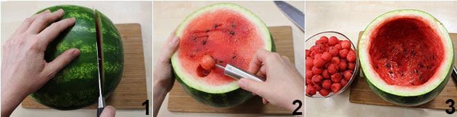 Para preparar la sandía procura conseguir una sandía redonda y regular, que se mantenga de pie si la apoyas sobre su extremo inferior y elimina la tapa aproximadamente a 3/4 de su altura 1. Si no se mantiene de pie, iguala también la parte inferior. Vacía la sandía con la ayuda de un sacabolas de forma semiesférica 2, hasta obtener 500 gr de pulpa en forma de bolitas y resérvalas en un bol 3.