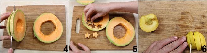 Ahora procede con la limpieza de la otra fruta: corta el melón en rodajas de 1 cm de grosor 4 y con moldes, por ejemplo en forma de corazón o estrella, obtén aproximadamente 500 gr de pulpa 5. Lava y pela los melocotones, quita el hueso y corta la pulpa en cubitos 6.