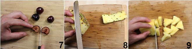 Lava las cerezas, quítales el pedúnculo, córtalas por la mitad y elimina el hueso 7. Pasa a la piña: corta la corona y luego la cáscara alrededor, con un cuchillo de sierra, ya que es muy dura y gruesa 8. Divídela a la mitad y corta la pulpa en triángulos 9.