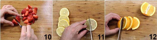 Lava las fresas, elimina el pedúnculo verde y córtalas a lo largo 10. Corta el limón y la naranja en rodajas finas, que dividirás en cuatro partes (11-12).