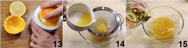 En este punto, extrae el zumo de un limón y de dos naranjas 13 que filtrarás y verterás en un bol grande 14. Vierte en el zumo obtenido todo el vino moscatel 15