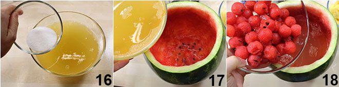 añade el azúcar 16 y mezcla bien. Vierte la mezcla obtenida en la sandía vaciada 17 y cuidadosamente toda la fruta pelada anteriormente empezando por las bolitas de sandía 18.
