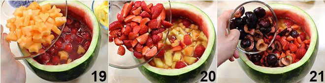 Añade luego las formas de melón 19, la piña y las fresas 20, las cerezas 21,