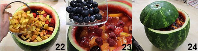 los melocotones 22, y finalmente las frambuesas y los arándanos 23. Mezcla con una cuchara y cubre la sandía con la tapa superior cortada al inicio. Pon la sandía en el frigorífico al menos durante dos horas y aquí tienes tu sandía bien fresca lista para servir en tazas individuales y decorarlas con las rodajas de limón y naranja cortadas anteriormente.