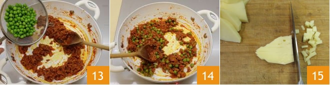 Hacia la mitad de la cocción, añadid los guisantes 13. Si es necesario, podéis añadir un poco de agua durante la cocción, teniendo en cuenta que el ragú al final no debe quedar líquido sino más bien denso 14. Mientras tanto, cortad el caciocavallo fresco en cubos 15.
