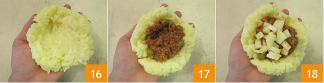 Cuando el arroz se haya enfriado completamente, podéis proceder a formar los arancini: preparad un bol de agua para humedeceros las manos y así poder manejar el arroz más fácilmente. Colocad en la palma de la mano un par de cucharadas de arroz (unos 120 g) y aplastadlo en el centro para crear un hueco 16, luego rellenad con una cucharadita de ragú 17 y algunos cubos de caciocavallo 18.