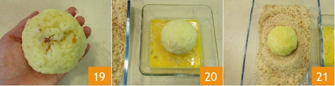 Moldead el arroz de modo que cubra el relleno y forme una bola 19. Proceded de esta manera para todos los arancini, luego dedicad al empanado: verted los huevos y el pan rallado en 2 boles diferentes y pasad cada uno primero por el huevo 20 y luego por el pan rallado 21, repitiendo la operación 2 veces.