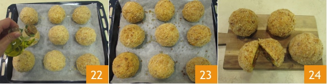 Colocad los arancini empanados en una bandeja cubierta con papel de horno y dejad reposar en el frigorífico durante unos 20 minutos. Luego verted un chorrito de aceite 22 y coced en horno estático precalentado a 190° durante unos 30 minutos. Una vez cocidos 23, servid vuestros arancini de arroz al horno aún calientes 24!