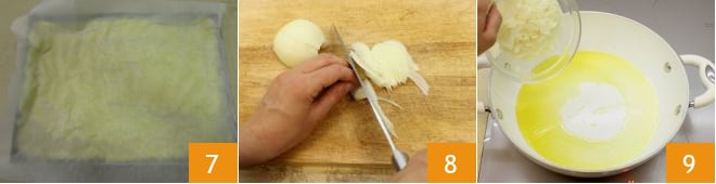 Cubrid el arroz con papel de horno y dejadlo enfriar a temperatura ambiente durante al menos 2 horas 7. Mientras tanto podéis dedicaros al ragú: pelad y cortad finamente la cebolla 8, luego derretid la mantequilla en una sartén junto con 2 cucharadas de aceite, añadid la cebolla 9 y dejadla sudar a fuego lento.