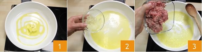 Para realizar los arancini de espaguetis, comienza con la preparación del ragú de carne: en una sartén antiadherente derrite, a fuego bajo, la mantequilla con un poco de aceite 1, luego añade la cebolla finamente picada 2 y sofríela durante unos minutos. Cuando la cebolla esté pochada, añade la carne picada y sofríe a fuego vivo durante 5 minutos 3;