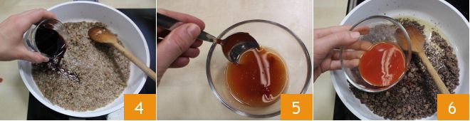 Luego añade el vino y deja evaporar 4. Diluye el concentrado de tomate en un poco de agua 5 y agrégalo a la carne 6, mezcla bien, ajusta de sal y pimienta y continúa la cocción durante 20 minutos a fuego moderado.