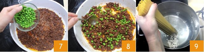 Cuando la carne esté casi cocida y la salsa se haya espesado, añade los guisantes congelados 7 y termina la cocción, mezclando a menudo para que los ingredientes no se peguen al fondo de la olla 8. Una vez listo, deja enfriar el ragú de carne y guisantes y ponlo en un bol cubierto con film transparente, luego guárdalo en el frigorífico. Lleva a ebullición abundante agua salada y cuece los espaguetis 9.