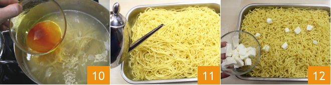 Mientras tanto, disuelve el azafrán en polvo con un poco de agua de cocción y añádelo a la pasta 10. Cuando los espaguetis estén cocidos (recomendamos no escurrirlos al dente), escúrrelos y ponlos en una bandeja con un poco de aceite, para que no se peguen 11. Deja que se enfríen completamente, luego condimenta con mantequilla 12;
