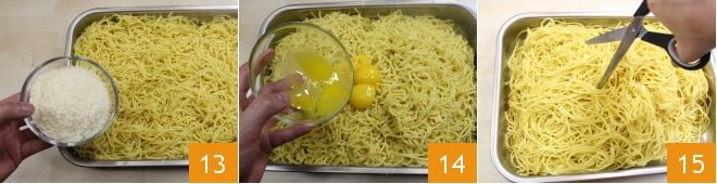Y queso parmesano rallado 13, ajusta de sal y añade las yemas 14. Mezcla bien todos los ingredientes y procede a cortar groseramente la pasta, ayudándote con unas tijeras de cocina 15.