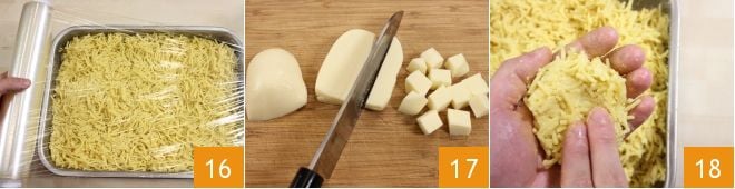 Cubre ahora la bandeja con film y guárdala en el frigorífico durante una noche 16. Pasado el tiempo indicado, saca la pasta y el ragú del frigorífico, luego corta en dados la scamorza 17. Comienza a formar los arancini tomando un poco de espaguetis y formando una bola, con dos dedos crea un hueco en el centro 18;