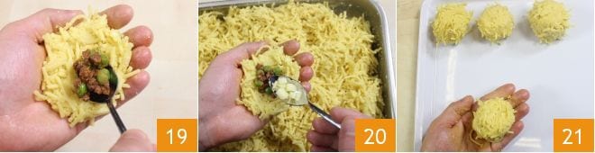 Y añade una cucharadita de ragú 19 y algunos trozos de queso 20. Siempre ayudándote con la presión de las manos, cierra el arancino y colócalo en una bandeja. Procede de la misma manera hasta formar todos los arancini.