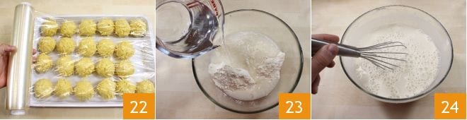 Cubre todo con film y colócalo en el frigorífico durante unos diez minutos. Mientras tanto, prepara la masa poniendo en un bol harina, agua y una pizca de sal 23. Con un batidor, mezcla todos los ingredientes, hasta formar una mezcla líquida y sin grumos 24.