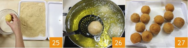 Calienta el aceite para freír y comienza a pasar, uno a uno, los arancini primero en la masa y luego en el pan rallado 25. Cuando el aceite esté bien caliente comienza a freírlos durante 5-6 minutos como máximo 26, o hasta que el rebozado esté dorado (para verificar que el aceite haya alcanzado la temperatura, realiza la prueba del palillo: introduce la punta de un palillo de madera en el aceite, si comienzas a ver que empieza a freír, entonces estará lo suficientemente caliente). Deja escurrir los arancini en una bandeja cubierta con papel absorbente para que pierdan todo el exceso de aceite 27. Entonces ¡tus arancini de espaguetis estarán listos para ser disfrutados!