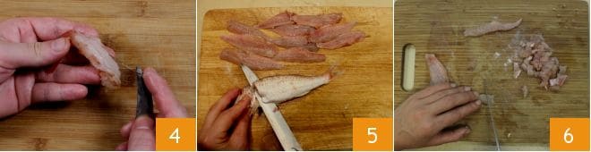 Con unas pinzas, quita el intestino de los camarones 4, el filete negro central. Luego limpia también las cigalas, separando la cabeza y cortando el caparazón con unas tijeras para sacar la carne; quita también el intestino y tritura tanto los camarones como las cigalas. Finalmente, coge los salmonetes ya limpios (como alternativa, ábrelos para quitarles las vísceras), haz un corte en los salmonetes en la parte superior insertando la hoja del cuchillo cerca de la cabeza y filetéelos 5, teniendo cuidado de quitar las espinas de los filetes con unas pinzas. Luego pica los filetes obtenidos 6.