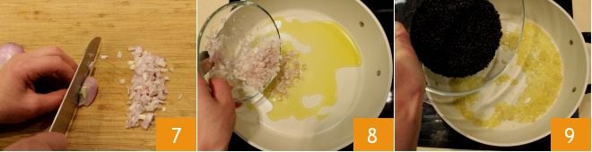 Reserva las preparaciones de pescado y dedícate a la cocción del arroz venere: pica la chalota 7 y viértela en una sartén amplia con un chorrito de aceite 8. Sofríe a fuego lento evitando que la chalota se queme, luego añade el arroz venere 9.