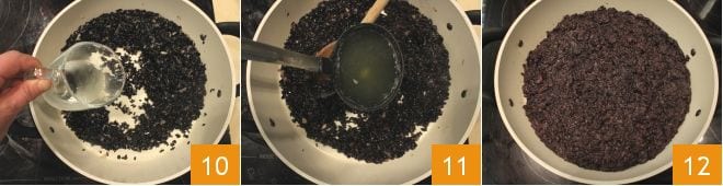 Tostar el arroz, luego después de 5 minutos vierte el vino blanco 10 y poco a poco el caldo de pescado 11 para favorecer la cocción del arroz venere (la cocción de esta calidad de arroz es muy larga, puedes reducir el tiempo usando una olla a presión o comprando arroz venere precocido). Hacia el final de la cocción, añade un poco de almidón de arroz que hará que los arancini sean más compactos cuando los vayas a formar. Termina la cocción y apaga el fuego 12.