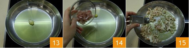 Mientras el arroz venere cuece, en otra sartén vierte abundante aceite y dora un diente de ajo 13. Luego vierte el pescado triturado anteriormente 14, sala y pimienta a gusto 15 y deja cocer durante 2 minutos.