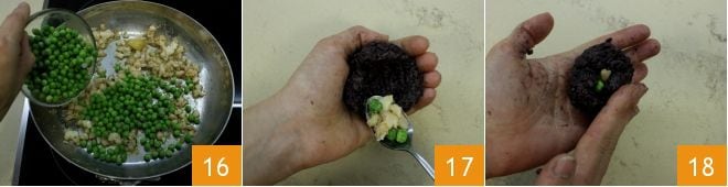 Añade los guisantes 16 y cuece unos minutos (si usas guisantes congelados, puedes escaldarlos primero unos minutos en agua hirviendo); luego retira el ajo y apaga el fuego. Deja enfriar las preparaciones y una vez frías puedes formar los arancini: humedece tus manos con un poco de aceite, luego aplana un poco de arroz en la palma de la mano y haz un hueco en el centro. Vierte el relleno dentro del arroz 17 y ciérralo 18 formando una bolita. Para dar la forma clásica del arancino, forma la bolita y luego aprieta una parte para formar un ápice.