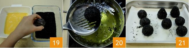 En un bol bate los huevos y prepara las semillas de sésamo negro; luego pasa los arancini primero por el huevo batido y después por el sésamo negro 19 cubriendo cuidadosamente toda la superficie. Fríe uno o dos arancini a la vez en abundante aceite de semillas (no debe superar la temperatura de 170°) 20, luego colócalos en una bandeja cubierta con papel absorbente 21. ¡Sirve tus arancini calientes o tibios!