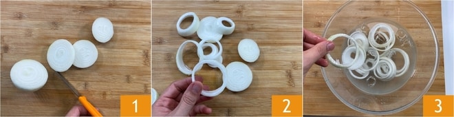 Para preparar los aros de cebolla, lo primero que hay que hacer es limpiar las cebollas y cortarlas en rodajas gruesas de 1 cm 1; luego, sin romperlos, separad los aros 2. Trasladadlos a un bol con agua y hielo 3, durante 15 minutos. Este paso servirá para suavizar el sabor de las cebollas y hacer los aros más crujientes.