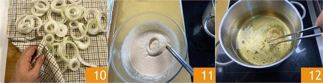 Transcurridos los 15 minutos, escurrid los aros de cebolla y secadlos bien con un paño 10. Prestad atención a esta operación porque si quedan húmedos, la tempura podría despegarse en la cocción; además, el aceite podría salpicar. En este punto, poned a calentar el aceite en una cacerola, llevándolo a una temperatura de 170°. Recuperad la tempura y, ayudándoos con unas pinzas, sumergid el primer aro. Dejad que escurra el exceso de tempura 11 y sumergidlo en el aceite caliente 12.